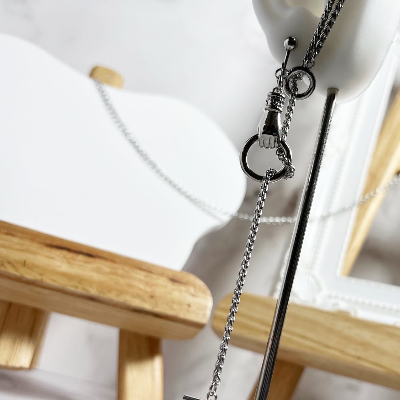 チェーンイヤーフックと、手のチャームのセットでお楽しみください。